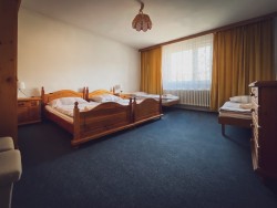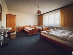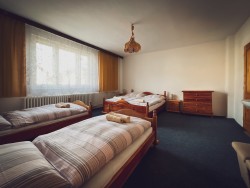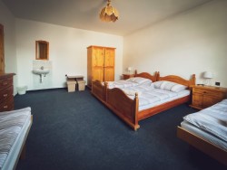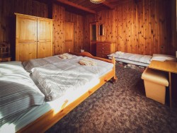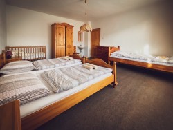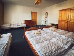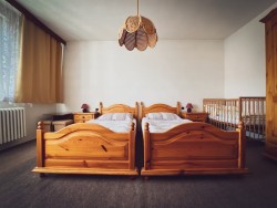 Na prvom poschodí sa nachádzajú 4 spálne (jedna trojlôžková s detskou postieľkou a tri štvorlôžkové), dve kúpeľne s vaňou a toaletou.